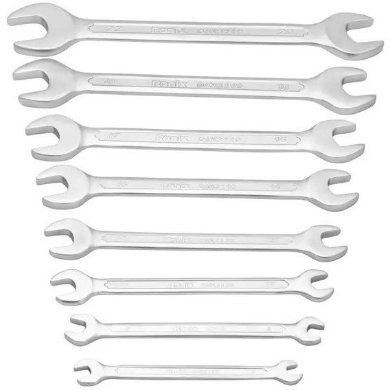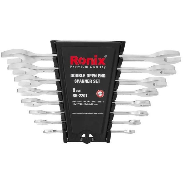 ست آچار دو سر تخت رونیکس تحت عنوان کد محصول RH-2201 ، دارای 8 عدد آچار از جنس آلیاژ کروم وانادیوم است که برای ضد خط و خش بودن، به صورت کاملا با کیفیت، با کروم آبکاری شده و نیز، برای افزایش دوام و ارتقای خواص مکانیکی، تحت عملیات حرارتی و سختکاری قرار گرفته است. این مجموعه دارای بدنه آنتی اسکید است تا از سر خوردن دست کاربر در حین فعالیت، جلوگیری کند. این ست آچار دو سر تخت که مطابق با استاندارد DIN 3110 و بر حسب استاندارد متریک تولید شدهاست، مجموعا 886 گرم وزن داشته و در بسته بندی طراحی شده توسط رونیک