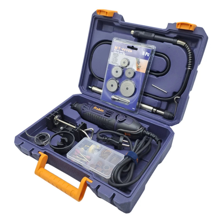 فرز انگشتی 200 پارچه رابین « R3120» یکی از مدلهای با کیفیت و کارآمد تولید شده توسط شرکت رابین است. این مدل بسیار با دوام و با کیفیت و البته خوش دست طراحی شده تا بتوانید از آن سالیان طولانی استفاده کنید. خوش دست بودن دستگاه فرز انگشتی رابین موجب شده تا در استفادههای طولانی مدت، اصلا احساس خستگی نکنید. فرز انگشتی رابین با قطعات مختلف و متنوعی همراه شدهاند که همگی بسیار منظم و مرتب در جعبه قرار میگیرند. پس از استفاده از فرز انگشتی میتوانید تمامی قطعات را در جعبه قرار دهید تا از گم شدن آنها جلوگیری شود. فرز رابین با موتور 200 واتی و قابلیت تنظیم سرعت تولید شده است. با وجود این موتور خوب و البته قطعات همراه فرز میتوانید انواع کارهای مختلف را با فرز انگشتی رابین انجام دهید. با استفاده از این فرز میتوانید کار فرز کاری، ساب زنی، حکاکی و ... را بر روی متریالهای مختلفی از جمله سنگ، فلز، پلاستیک، چوب و ... انجام دهید.