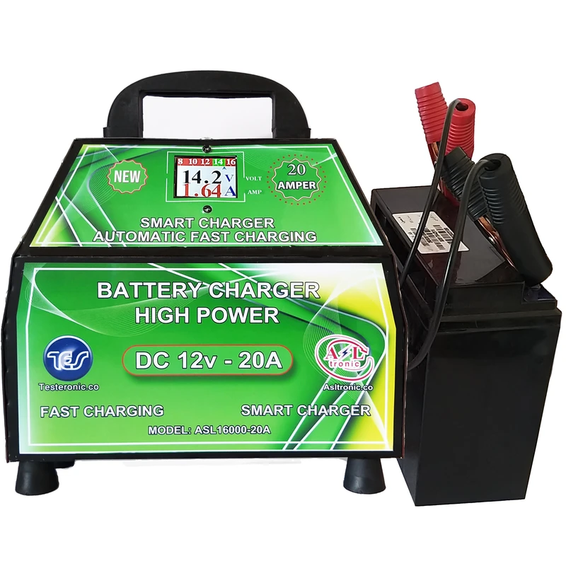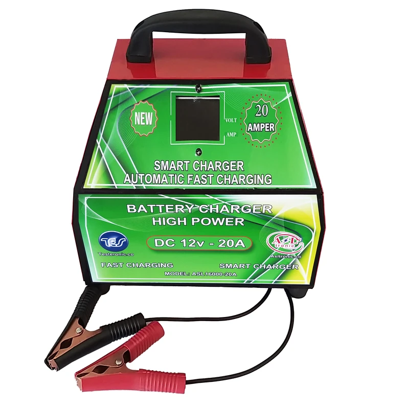 شارژر سریع و اتوماتیک انواع باتری های خودرویی، موتوری و یو پی اس. این شارژر با استفاده از آخرین تکنولوژی سوئیچینگ روز دنیا جریان شارژ باتری را متناسب با ظرفیت و میزان شارژ اولیه ی باتری مشخص می کند. جریان شارژ رفته رفته با توجه وضعیت باتری کاهش داده شده و سرانجام پس از شارژ کامل جریان شارژ به محدوده صفر خواهد شد. این شارژر دارای نمایشگر LCD ولتاژ و جریان باتری در حال شارژ بوده و لحظه به لحظه مقادیر ولتاژ باتری را را به صورت نموداری ثبت می کند. سر انجام با فول شارژ شدن باتری ولتاژ به حداکثر یعنی حدود 14.7 تا 14.9 می رسد. و جریان شارژ به حداقل یا صفر می رسد. این شارژر بالاترین محافظت را برای شارژ مناسب و جلوگیری از آسیب به باتری دارد. برای شروع شارژ باتری کافیست برق دستگاه وصل شده و کلید شارژ روشن شود. با اتصال گیره های دستگاه به دو سر باتری وضعیت شارژ باتری برروی LCD دستگاه به صورت آمپر و ولتاژ مشخص شده است. در ابتدا نمایشگر آمپر روی دستگاه مقداری را نمایش می دهد که نشان دهنده خالی بودن باتری و جریان کشی آن است. با افزایش شارژ مقدار ولتاژ از مقدار اولیه نمایش داده شده بیشتر می شود اما مقدار جریان نمایش داده شده اولیه کاهش می یابد تا به صفر برسد.