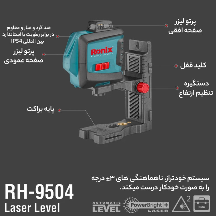 دارای عملکرد دو خط عمودی و یک خط ۳۶۰ درجه افقی به همراه نقطه زن شاقول تحتانی دارای قابیت نمایش خطوط به صورت هم زمان برای انجام طیف وسیعی از فعالیت ها قادر به تنظیم سریع و بدون زحمت برای طرح خطوط افقی یا عمودی مجهز به قابیت خود ترازی اتوماتیک با دقت و سرعت بالا حین کارکرد دارای قابیت قفل پاندول جهت محافظت از سیستم لیزر دستگاه حین حرکت و جابه جایی عملکرد تراز به صورت خطوط اریب یا زاویه قائم در جهت دلخواه دارای بدنه ای بسیار مستحکم و پوشیده شده از رابر مقاوم در برابر ضربه ضد گرد و غبار و مقاوم در برابر رطوبت و سقوط از دست کاربر با استاندارد بین المللی IP۵۴ که از دستگاه در برابر سقوط از دست کاربر محافظت می کند و امکان کار در شرایط سخت مانند کار در محیط های بارانی یا پر از گرد و غبار را فراهم میکند دارای قایلیت کار با لوازم جانبی مختلف برای انجام عموم عموم فعالیت ها به آسانی مجهز به پایه آهن ربایی منحصر به فرد جهت اتصال به تکیه گاه های فلزی و همچنین قابلیت اتصال به دیوار و یا اشیای غیر فلزی قابلیت تصب بر روی سه پایی