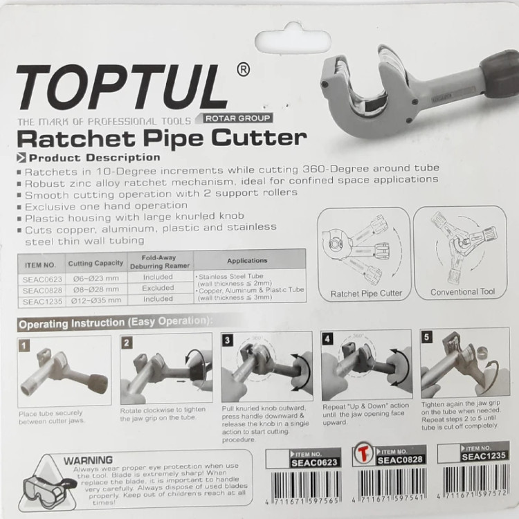 لوله بر مدل SEAC0828 از برند تاپ تول (Toptul)، ابزاری دقیق و کارآمد برای برش لولههای مسی، آلومینیومی و لولههای نازک فلزی در صنایع برودتی، تهویه مطبوع، لولهکشی و تعمیرات خودرو است. این لوله بر با ظرفیت برش از 3 تا 28 میلیمتر (معادل 1/8 تا 1-1/8 اینچ)، قابلیت انطباق بالایی با انواع پروژهها دارد.