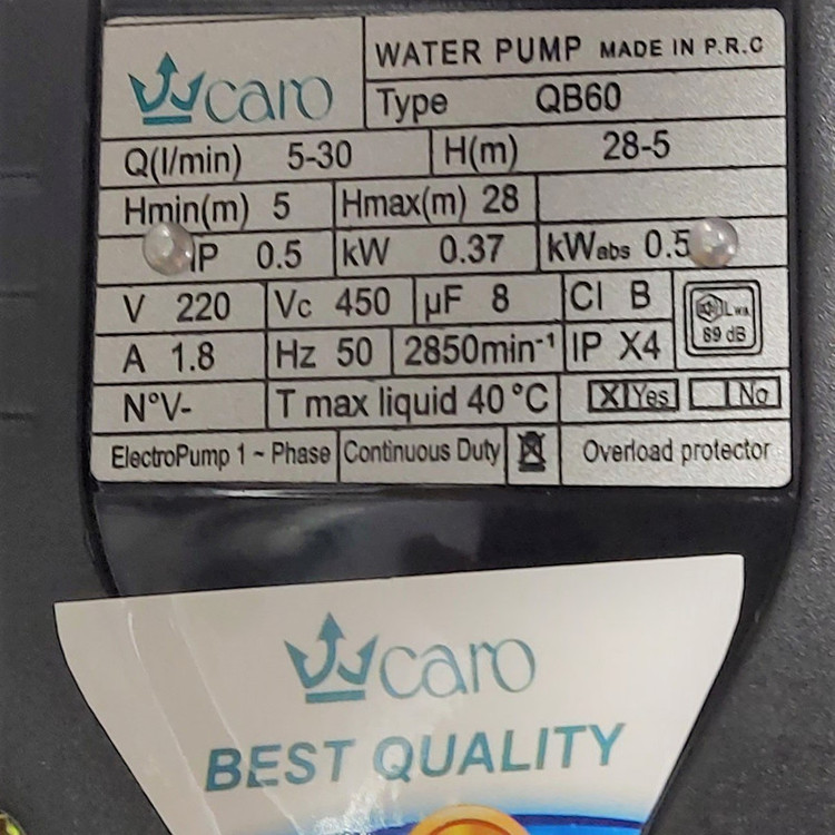 الکتروپمپ کارو مدل QB60 از سری پمپ های چینی با کیفیت مناسب برای یک واحد قدرت نیم اسب (0.37kw) سیم پیچ مس شافت استیل حداکثر آبدهی 30 لیتر بر دقیقه حداکثر ارتفاع 28 متر حداکثر دمای شرایط کاری 40 درجه