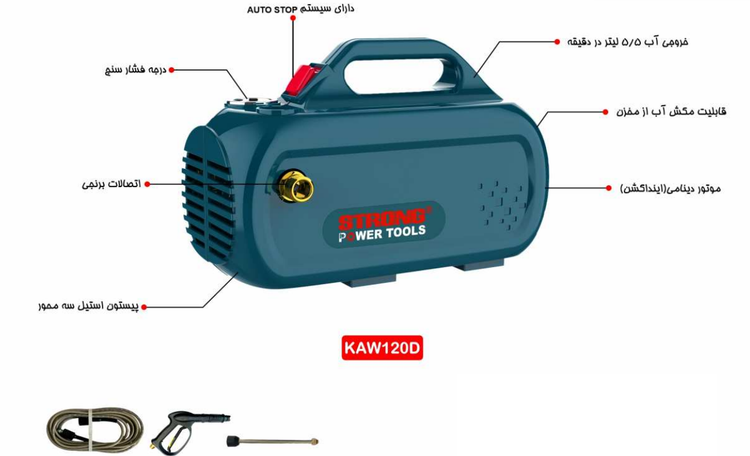 کارواش 120 بار دینامی 1200 وات استرانگ مدل KAW120D دارای پمپ با پیستون استیل سه محور و توانایی کشش آب از مخزن راکد را دارا میباشد. توانایی کار با آب گرم تا 50 درجه نیز از ویژگی های این دستگاه به حساب می آید. دستگاه کارواش خانگی، که به آن کارواش فشار قوی خانگی نیز گفته می شود، یک ابزار مفید برای شستشو و تمیز کردن خودرو ها، فضا های بیرونی، و سطوح مختلف در خانه است. این دستگاه ها به گونه ای طراحی شده اند که آب را با فشار بالا از طریق نازل به بیرون پرتاب می کنند، که این فشار بالا باعث تمیز شدن سطح مورد نظر میشود.