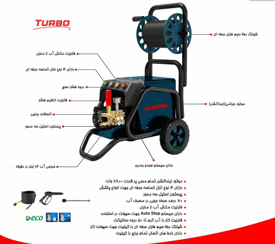 پمپ قوی: مجهز به پمپ قوی که آب را با فشار بالا پمپاژ میکند.
