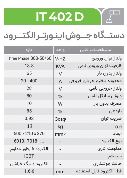 it 402 D دستگاه جوش اینورتر الکترود (سه فاز) ایران ترانس