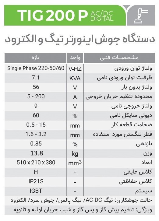 - مناسب برای جوشکاری تیگ DC و تیگ DC پالسی، تیگ AC و تیگ AC پالسی، جوش سرد نقطه ای (spot) و جوشکاری الکترود .