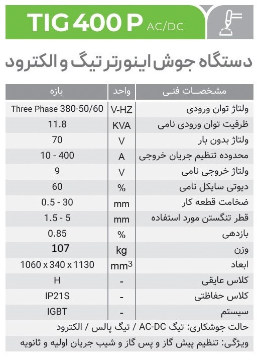 - مناسب برای جوشکاری تیگ DC و تیگ DC پالسی، تیگ AC و تیگ AC پالسی و جوشکاری الکترود