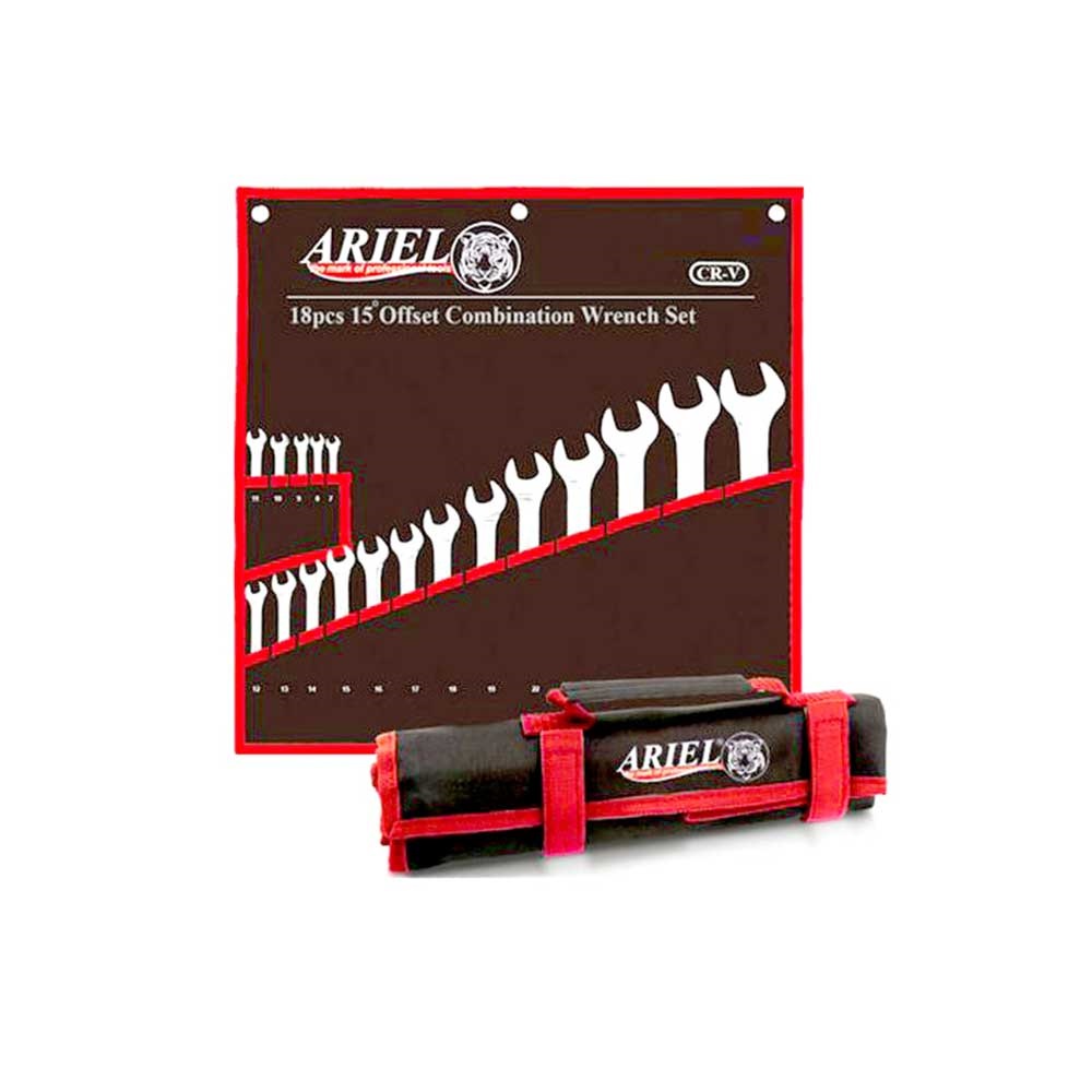 مجموعه ۱۸ عددی آچار یکسر رینگی آریل ARIEL مدل ARAY1801 شامل سایزهای ۷ تا ۳۲ میلیمتر، ساخته شده از فولاد کروم-وانادیوم با کیفیت بالا و ارائهشده در کیف برزنتی قابل حمل. مناسب برای کارگاهها، تعمیرگاهها و کاربرد صنعتی.