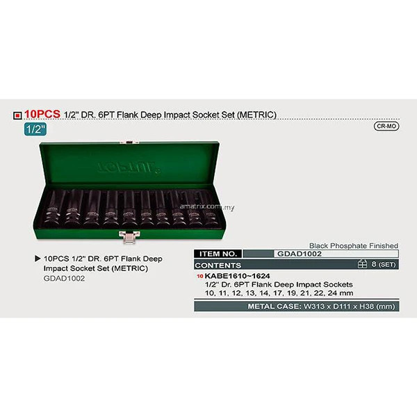 جعبه بکس 10 پارچه 1/2 درایو 6 پر فشار قوی بلند تاپ تول (TOPTUL) مدل GDAD1002