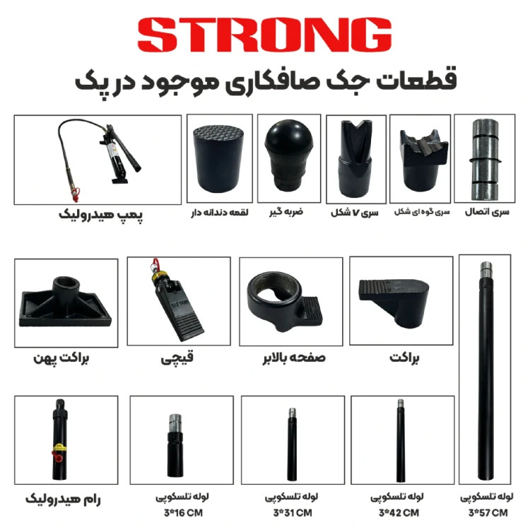 جک صافکاری 10 تن سری پلاس استرانگ مدلSTG4611_PLUS یک محصول از سری پلاس محصولات شرکت استرانگ است که تمامی لقمه های آن از جنس فولاد بوده و دارای کیف BMC حرفه ای چرخدار برای حمل راحت تر این محصول سنگین میباشد.