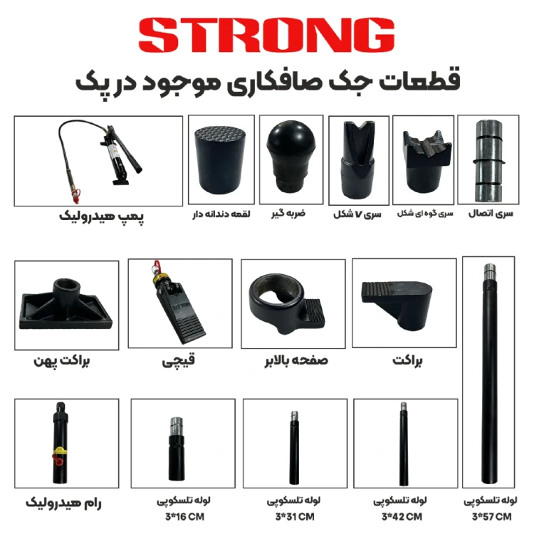 جک صافکاری 10 تن سری پلاس استرانگ مدل STG4611_PLUS دارای حداقل ارتفاع 325 میلیمتر و حداکثر ارتفاع 455 میلیمتر میباشد. این جک دارای وزن 31 کیلوگرم و از رنگ کاری کوره ای بهره میبرد. جک صافکاری یکی از ابزار های حیاتی در صنعت صافکاری خودرو است که برای ترمیم و اصلاح بدنه خودرو ها استفاده می شود. این دستگاه به صافکاران کمک می کند تا بدنه های آسیب دیده خودرو را به حالت اولیه بازگردانند.