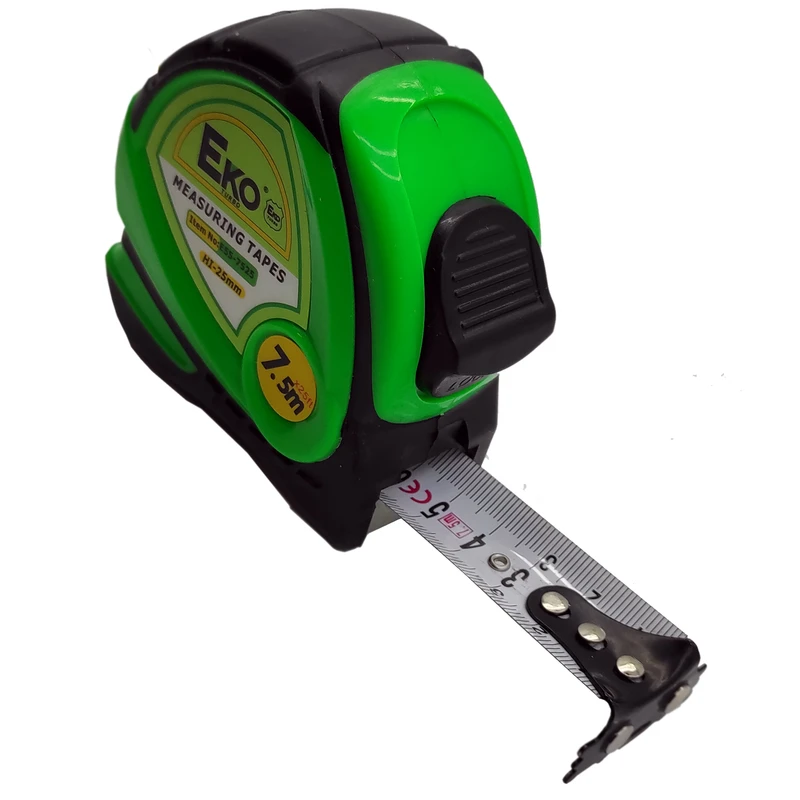 بدنه ضد ضربه و محکم از جنس ABS دارای روکش لاستیکی ضربه گیر تیغه سفید , براق با مقیاس متریک قلاب آهن ربایی قوی و ۳ پرچ دارای بست کمر بندی دارای صفر اتوماتیک